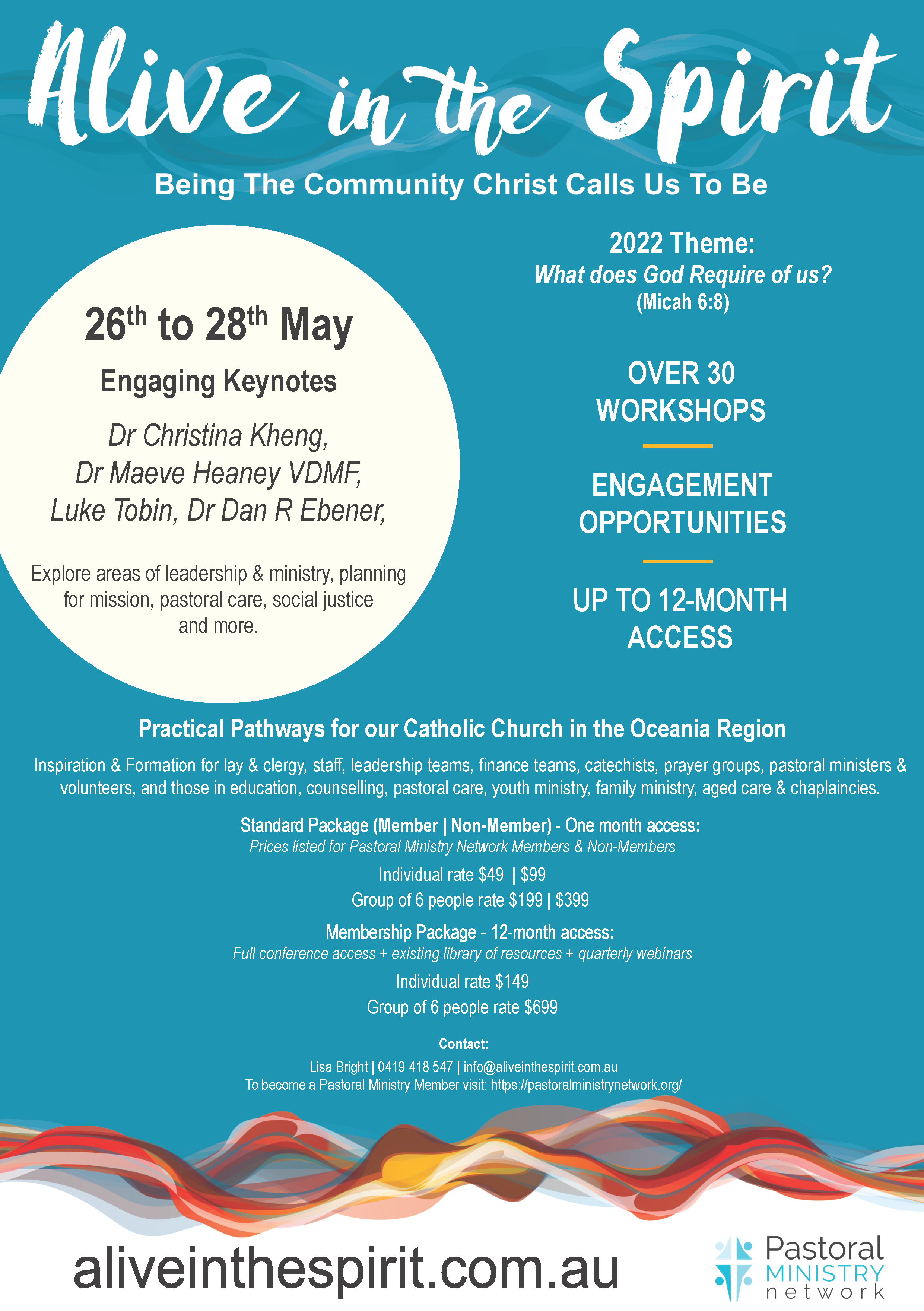 With parishes and dioceses hungering for fresh hope, new ideas, and positive stories and models of practice in service of Christ’s mission, Alive in the Spirit delivers with over thirty presentations from Australian and New Zealand based practitioners, balancing on-screen input with time for off-screen prayer, reflection and a call to action. There is time for networking with participants, and guides are available to accompany either an individual or group three-day intensive or a one-month engagement.